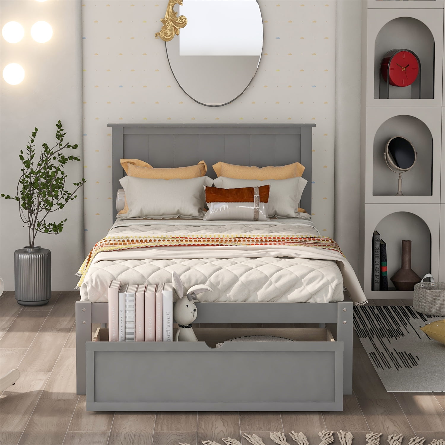 Twin Bed For Kids With Storage Drawer Upgrade Pine Wood Bed Frame With Headboard And Footboard Modern Kids Bed Furniture For Bedroom Holds 275 Lb No Box Spring Needed Gray Walmart Com